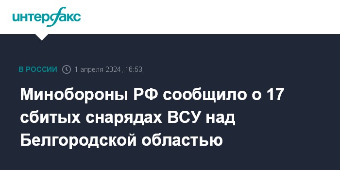 Москва. 1 апреля. INTERFAX.RU - Российские военные сбили 17 снарядов реактивной системы залпового огня над Белгородской областью, заявили в Минобороны РФ в понедельник.