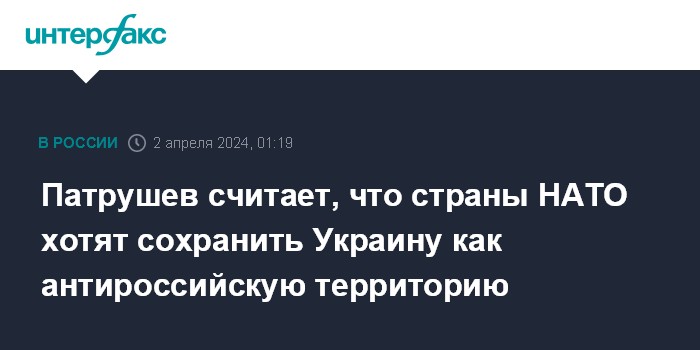 Москва. 2 апреля. INTERFAX.RU - Секретарь Совбеза России Николай Патрушев заявил, что США и члены НАТО хотят сохранить Украину или ее часть как подконтрольную им антироссийскую территорию.