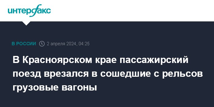 Москва. 2 апреля. INTERFAX.RU - Столкновение пассажирского поезда и сошедших с путей грузовых вагонов произошло в Красноярском крае, сообщает пресс-служба Западно-Сибирской транспортной прокуратуры.