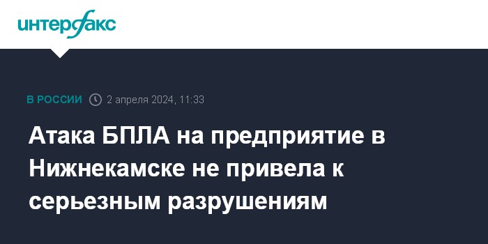 Москва. 2 апреля. INTERFAX.RU - В результате атаки беспилотников на одно из предприятий Нижнекамска никто не пострадал, предприятие не получило серьезных повреждений, сообщил в телеграм-канале мэр города Рамиль Муллин.