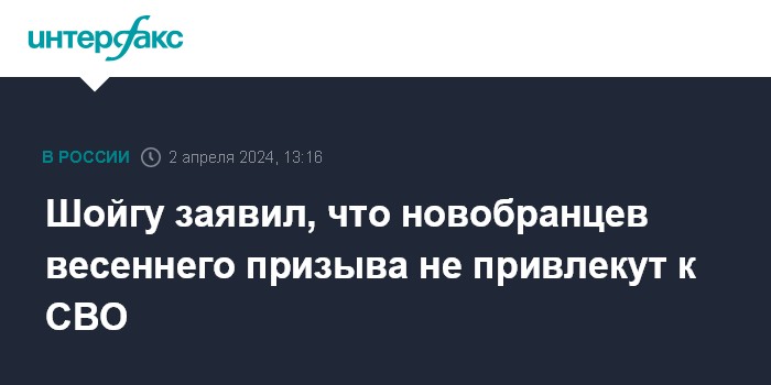 Москва. 2 апреля. INTERFAX.RU - Новобранцев весенней призывной кампании не будут привлекать к участию в специальной военной операции (СВО) на Украине, заявил министр обороны РФ Сергей Шойгу на селекторном совещании с руководящим составом Вооруженных сил РФ.