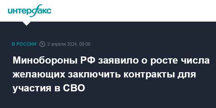 Москва. 2 апреля. INTERFAX.RU - Более 100 тыс. человек заключили с начала года контракты на службу в Вооруженных силах РФ, растет число желающих участвовать в специальной военной операции (СВО) на Украине, сообщило Минобороны РФ в среду.