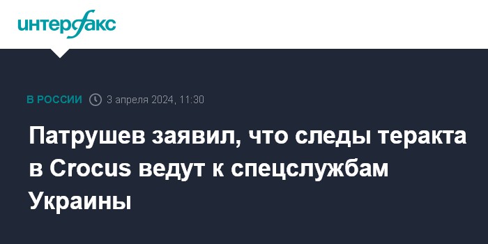 Москва. 3 апреля. INTERFAX.RU - Секретарь Совета безопасности России Николай Патрушев сообщил, что следы теракта в концертном зале Crocus City Hall ведут к украинским спецслужбам.