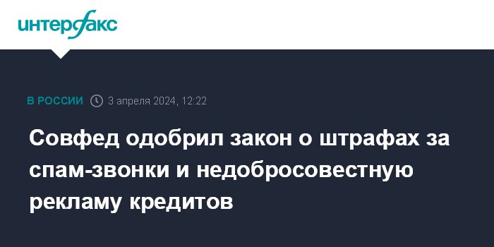 Москва. 3 апреля. INTERFAX.RU - Совет Федерации на заседании в среду проголосовал за закон, предусматривающий штрафы до 1 млн рублей за спам-звонки и вдвое повышающий штрафы для банков за ненадлежащую рекламу кредитных услуг.
