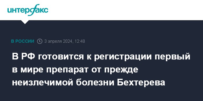 Москва. 3 апреля. INTERFAX.RU - В России завершаются исследования для регистрации первого в мире лекарственного препарата от ранее неизлечимой болезни Бехтерева (хроническое системное заболевание суставов), сообщил премьер-министр РФ Михаил Мишустин.