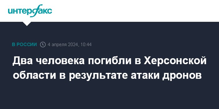 Москва. 4 апреля. INTERFAX.RU - Два человека погибли в Херсонской области в результате удара дронами со стороны ВСУ, сообщил в четверг председатель правительства региона Андрей Алексеенко.
