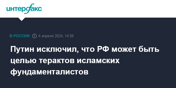 Москва. 4 апреля. INTERFAX.RU - Россия не может быть объектом террористических атак со стороны исламских фундаменталистов, главная цель заказчиков теракта в Crocus City Hall - нарушить единство в стране, заявил на съезде Федерации независимых профсоюзов России президент Владимир Путин.
