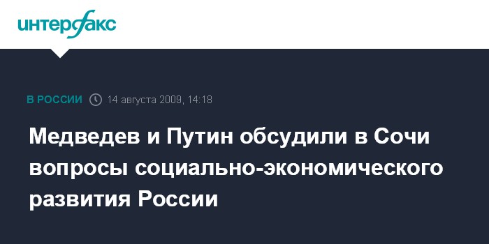 Сочи. 14 августа. INTERFAX.RU - Президент РФ Дмитрий Медведев и премьер-министр Владимир Путин провели в пятницу в Сочи рабочую встречу. Во время беседы, которая состоялась до начала переговоров главы российского государства с канцлером ФРГ Ангелой Меркель, речь шла о вопросах социально-экономического развития России, а также о ряде других актуальных проблемах.