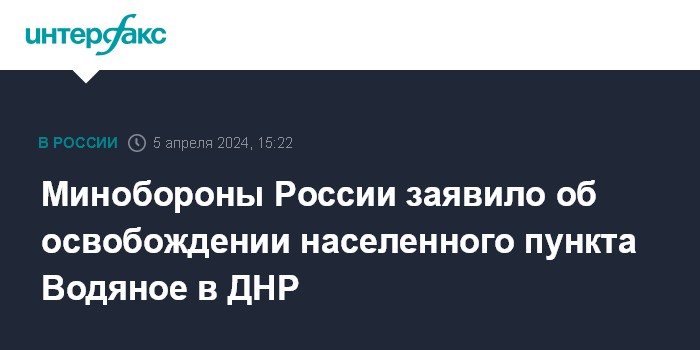 Москва. 5 апреля. INTERFAX.RU - Вооруженные силы России взяли под контроль населенный пункт Водяное в ДНР, сообщило министерство обороны РФ в пятницу.