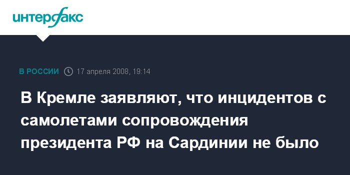 Москва. 17 апреля. ИНТЕРФАКС - Кремль опровергает сообщения об инцидентах на Сардинии, связанных с самолетами сопровождения президента РФ.