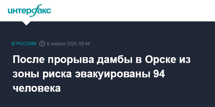 Москва. 6 апреля. INTERFAX.RU - В Орске Оренбургской области, где накануне прорвало дамбу, из зоны риска эвакуированы 94 человека, в том числе 40 детей, сообщила пресс-служба главы региона Дениса Паслера.