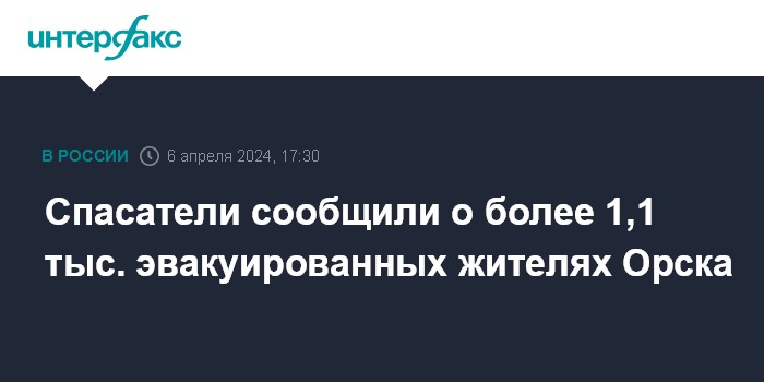 Москва. 6 апреля. INTERFAX.RU - МЧС РФ эвакуировало из пострадавшего от прорыва дамбы Орска более 1,1 тыс. жителей, сообщила пресс-служба министерства в субботу.