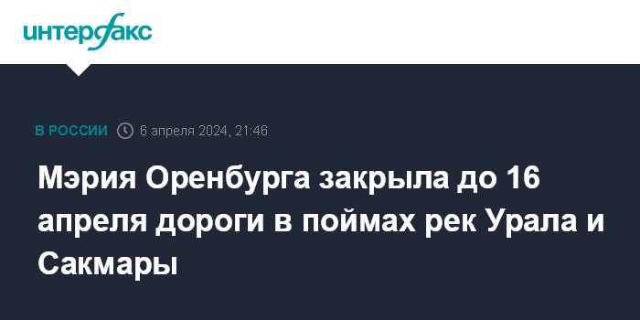 Москва. 6 апреля. INTERFAX.RU - Мэрия Оренбурга запретила до 16 апреля движение по дорогам в поймах рек Урала и Сакмары, уровень воды в которых резко вырос из-за паводка, сообщила пресс-служба мэрии.