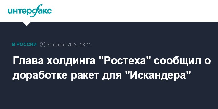Москва. 6 апреля. INTERFAX.RU - Ракеты для оперативно-тактических ракетных комплексов "Искандер" прошли доработку, заявил генеральный директор АО "НПО "Высокоточные комплексы" (входит в "Ростех) Олег Рязанцев.
