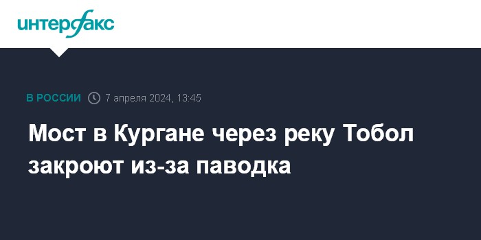 Москва. 7 апреля. INTERFAX.RU - Власти Кургана закрывают проезд по Мало-Чаусовскому мосту через реку Тобол, сообщается в официальном телеграмм-канале мэрии.