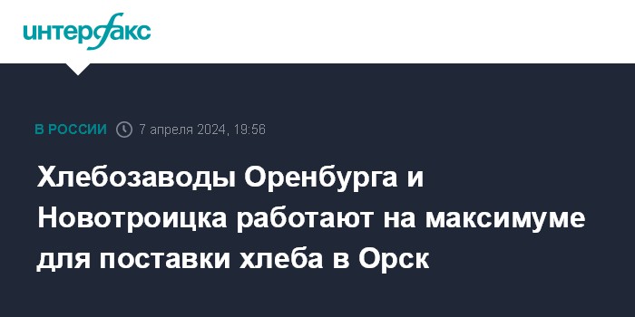 Москва. 7 апреля. INTERFAX.RU - Хлебозаводы Оренбурга и Новотроицка полностью загрузили свои мощности, чтобы обеспечить хлебом жителей подтопленного паводком города Орска, сообщила пресс-служба главы региона в воскресенье.