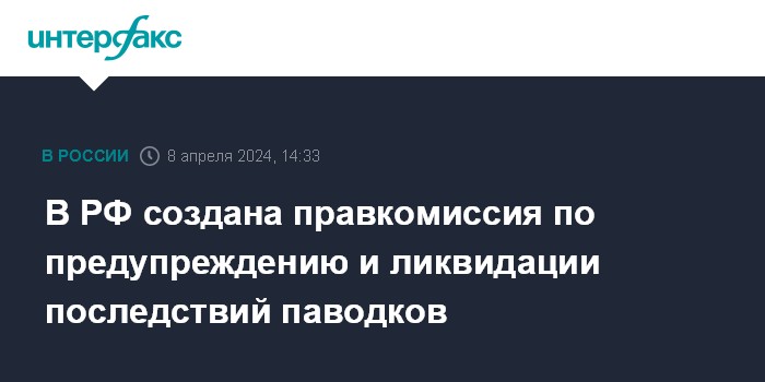 Москва. 8 апреля. INTERFAX.RU - Премьер РФ Михаил Мишустин подписал распоряжение о создании правительственной комиссии, которая займется координацией работ по предупреждению и ликвидации последствий паводков на территориях отдельных регионов страны, сообщается в телеграм-канале правительства России.