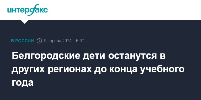 Москва. 8 апреля. INTERFAX.RU - Завершилась работа по согласованию с регионами продления срока пребывания у них эвакуированных белгородских детей до конца текущего учебного года, сообщил во "ВКонтакте" губернатор Белгородской области Вячеслав Гладков.