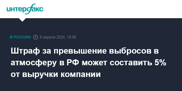 Москва. 8 апреля. INTERFAX.RU - Правительство РФ внесло в Госдуму законопроект, который прописывает линейку оборотных штрафов для компаний и ИП за несоблюдение квот по выбросам в атмосферу, максимальный штраф может составить 5% от годовой выручки, но не менее 5 млн рублей.