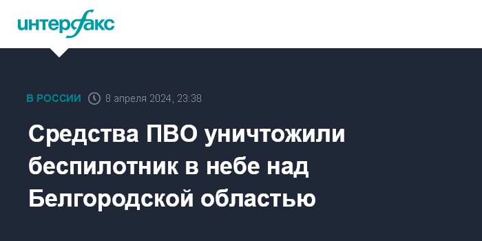 Москва. 8 апреля. INTERFAX.RU - Российские военные сообщили, что средства противовоздушной обороны вечером в понедельник уничтожили украинский беспилотник в небе над Белгородской областью.