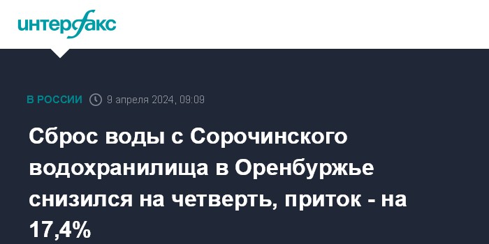 Москва. 9 апреля. INTERFAX.RU - Сорочинское водохранилище сократило сброс воды до 300 кубометров в секунду, сообщает администрация Сорочинского округа Оренбургской области.