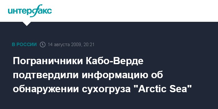 Лондон. 14 августа. INTERFAX.RU - Сухогруз "Arctic Sea" с российским экипажем, пропавший при странных обстоятельствах в районе побережья Португалии в конце июля, находится в 400 морских милях от островов Кабо-Верде, сообщает BBC, которая цитирует представителей погранслужбы Кабо-Верде.