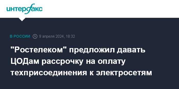 Москва. 9 апреля. INTERFAX.RU - Центры обработки данных (ЦОД), крупнейшей статьей расходов которых является электроэнергия, могли бы оплачивать техприсоединение к сетям в рассрочку, считает глава Ростелекома, крупнейшего игрока на этом рынке, Михаил Осеевский.