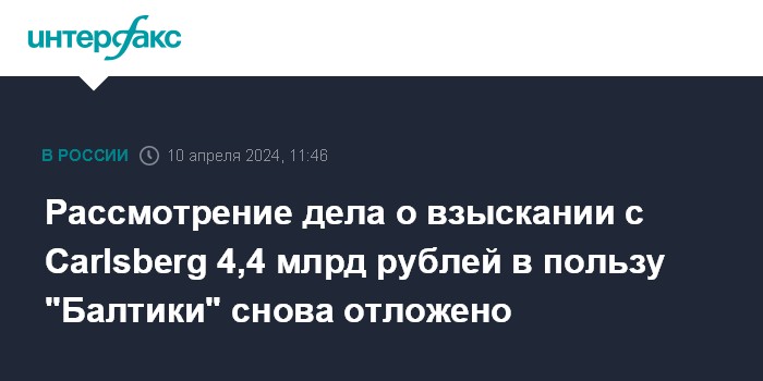 Москва. 10 апреля. INTERFAX.RU - Арбитражный суд Санкт-Петербурга и Ленинградской области вновь отложил начало рассмотрения дела о взыскании с датской Carlsberg Breweries A/S в пользу ООО "Пивоваренная компания "Балтика" долга в размере 4,411 млрд рублей, сообщается в картотеке арбитражных дел.