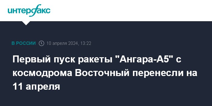 Москва. 10 апреля. INTERFAX.RU - Ранее отмененный пуск тяжелой ракеты-носителя "Ангара-А5" с космодрома Восточный перенесен на 11 апреля, сообщил гендиректор "Роскосмоса" Юрий Борисов.