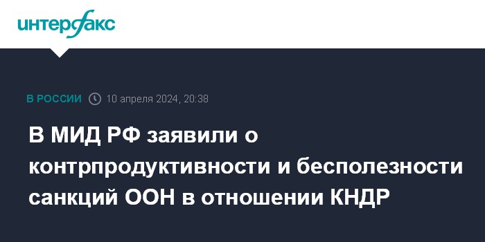 Москва. 10 апреля. INTERFAX.RU - Действующие в отношении КНДР международные санкции контрпродуктивны, оказывают негативное влияние на социально-экономическую ситуации в этой стране и на ситуацию в сфере безопасности в регионе, заявили в среду в МИД России.