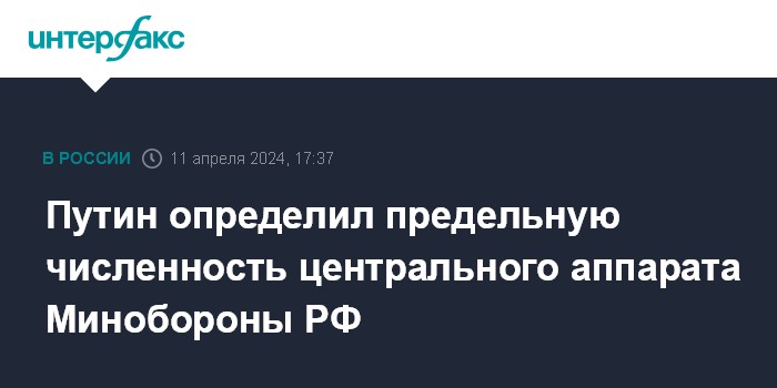 Москва. 11 апреля. INTERFAX.RU - Президент России Владимир Путин подписал указ, согласно которому предельная численность центрального аппарата Министерства обороны РФ определена в количестве 13 200 человек.
