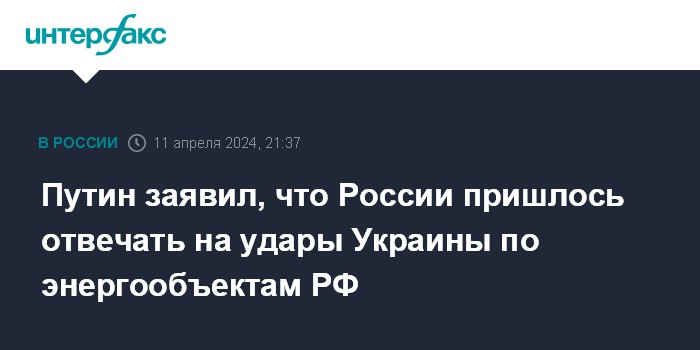 Москва. 11 апреля. INTERFAX.RU - Россия была вынуждена ответить на удары по ее энергообъектам со стороны Украины, хотя не делала этого зимой исходя из гуманитарных соображений, заявил президент РФ Владимир Путин.