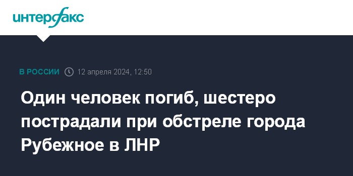 Москва. 12 апреля. INTERFAX.RU - Один мирный житель погиб, еще шестеро получили ранения в результате обстрела города Рубежное в Луганской народной республике со стороны украинской армии с применением кассетных боеприпасов в пятницу утром, сообщили в администрации Рубежного.