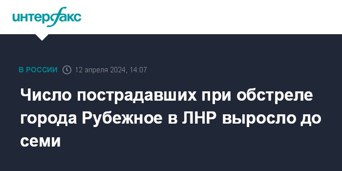 Москва. 12 апреля. INTERFAX.RU - Количество пострадавших от обстрела Рубежного со стороны украинской армии в пятницу утром увеличилось до семи, сообщили в правительстве ЛНР со ссылкой на региональный Минздрав.