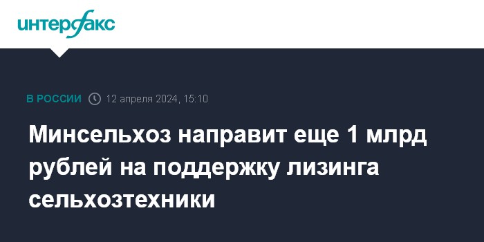 Москва. 12 апреля. INTERFAX.RU - Минсельхоз планирует в 2024 году дополнительно направить "Росагролизингу" 1 млрд рублей на поддержку лизинга сельхозтехники.