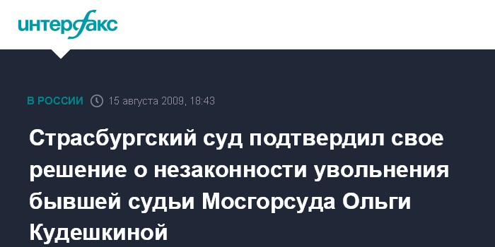 Москва. 15 августа. INTERFAX.RU - Минюст России прислал уведомление о выплате компенсации в размере 10 тыс. евро бывшей судье Мосгорсуда Ольге Кудешкиной, которая была лишена занимаемой должности в 2004 году, сообщила адвокат Анна Паничева.