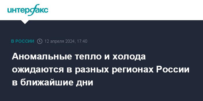 Москва. 12 апреля. INTERFAX.RU - Температура воздуха выше нормы на 7-13 градусов в ближайшие дни прогнозируется в Южном федеральном округе и на юге Дальнего Востока; очень холодная погода будет в Северо-Западном федеральном округе, на севере Урала, Сибири и Дальнего Востока, сообщил "Интерфаксу" научный руководитель Гидрометцентра России Роман Вильфанд.