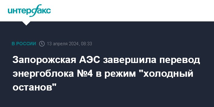 Москва. 13 апреля. INTERFAX.RU - Специалисты завершили перевод энергоблока №4 Запорожской АЭС (ЗАЭС) в режим "холодный останов", сообщает в телеграм-канале станции.