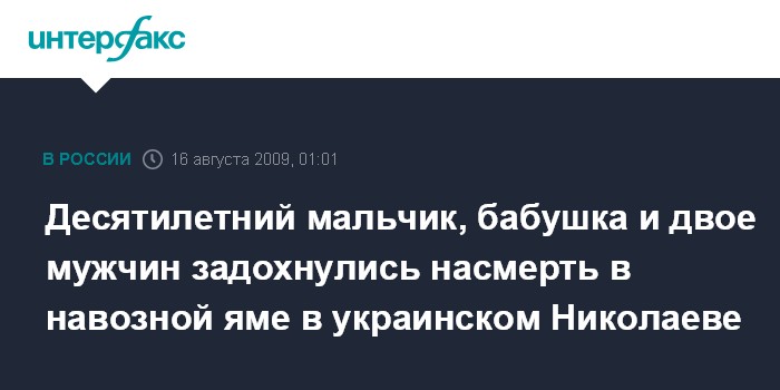 Киев. 16 августа. ИНТЕРФАКС-УКРАИНА - В городе Николаев в навозной яме погибли 10-летний мальчик и трое взрослых, которые пытались его спасти, сообщил агентству "Интерфакс-Украина" руководитель пресс-службы МЧС Украины Игорь Кроль.