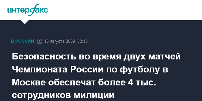Москва. 16 августа. ИНТЕРФАКС-МОСКВА - В воскресенье в столице пройдут футбольные матчи Чемпионата России "Локомотив" - ЦСКА и "Москва" - "Спартак", охрану порядка на них будут обеспечивать более 4 тыс. сотрудников милиции, сообщили "Интерфаксу" в оперативном информационном управлении столичного ГУВД.