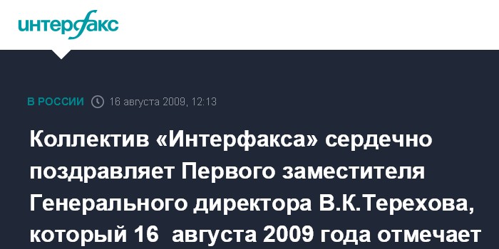 Коллектив «Интерфакса» сердечно поздравляет Первого заместителя Генерального директора В.К.Терехова, который 16 августа 2009 года отмечает 70-летие!