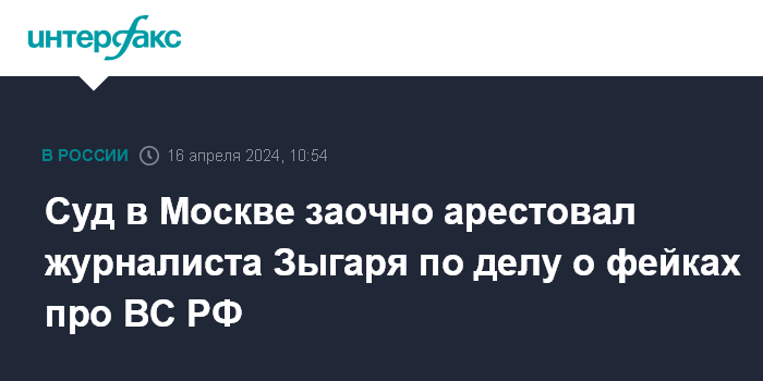 Суд в Москве заочно арестовал журналиста Зыгаря по делу о фейках про ВС РФ
