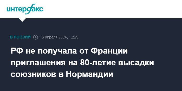 Москва. 16 апреля. INTERFAX.RU - Никаких официальных приглашений от Франции на празднование, посвященное 80-летию высадки союзников в Нормандии, Россия не получала, сообщил пресс-секретарь президента РФ Дмитрий Песков.