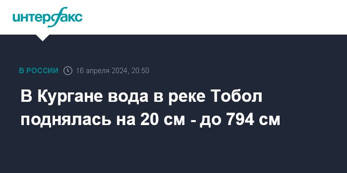 Москва. 16 апреля. INTERFAX.RU - В Кургане вода в реке Тобол за два часа поднялась на 20 см и к 22:00 (20:00 по Москве) достигла уровня 794 см, сообщила пресс-служба правительства Курганской области.