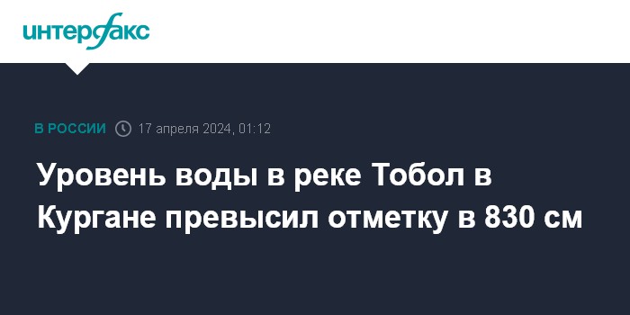 Москва. 17 апреля. INTERFAX.RU - Уровень воды в реке Тобол в Кургане в результате половодья увеличился до 830 см, следует из данных карты "Паводок", сообщает пресс-служба правительства Курганской области.