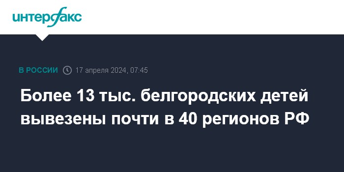 Москва. 17 апреля. INTERFAX.RU - Губернатор Белгородской области Вячеслав Гладков сообщил о прибытии очередных групп детей в ряд российских регионов.