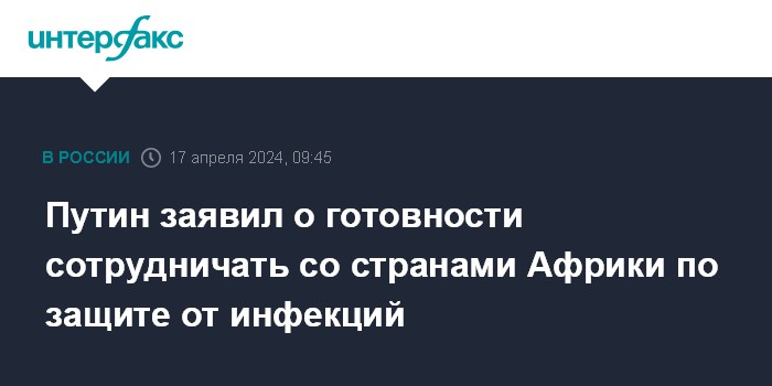 Москва. 17 апреля. INTERFAX.RU - Россия готова к тесному сотрудничеству с государствами Африки в сфере защиты населения от опасных заболеваний и наращивания медицинского потенциала этого континента в сфере здравоохранения, сообщил президент РФ Владимир Путин.