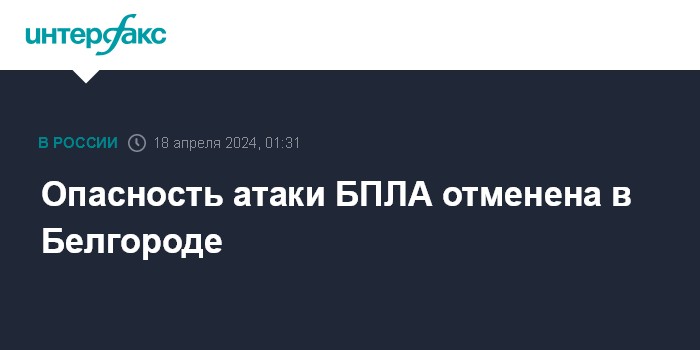 Москва. 18 апреля. INTERFAX.RU - Опасность атаки БПЛА отменена в Белгороде, сообщает телеграм-канал мэрии города.