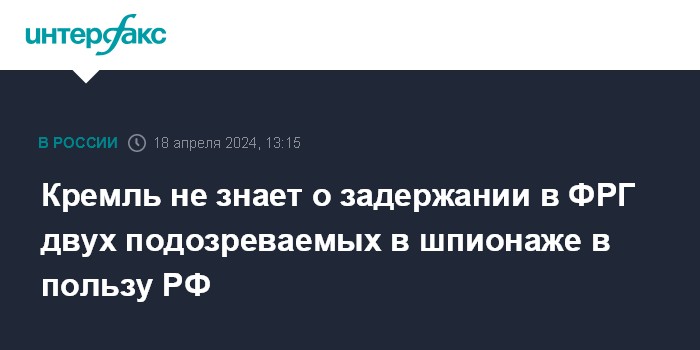 Москва. 18 апреля. INTERFAX.RU - Кремль не располагает информацией о задержании в Германии двух граждан ФРГ и РФ по подозрению в подрывной деятельности против Украины и шпионаже в пользу России, заявил пресс-секретарь российского президента Дмитрий Песков в четверг.