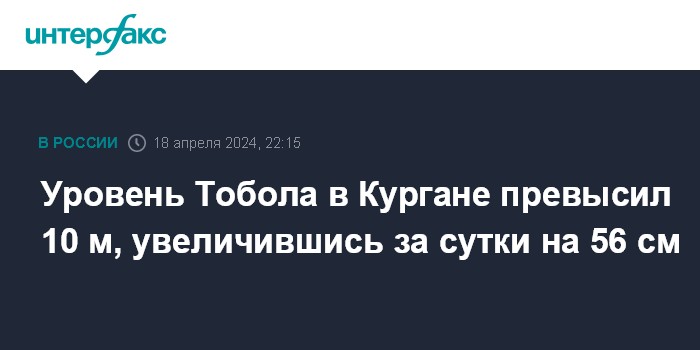 "По данным на 00:00 местного времени (22:00 мск), он составил 1002 см, увеличившись за сутки на 56 см. "На некоторых участках в Кургане уровень воды в Тоболе ранее уже превысил максимум 1994 года и отметку в 10 метров", - говорится в сообщении.